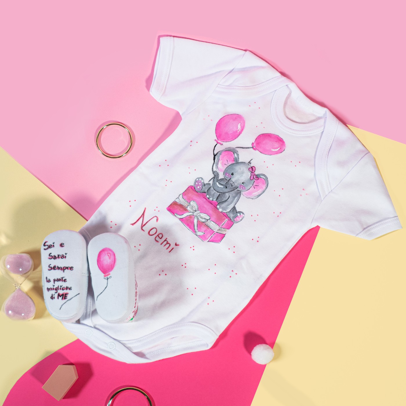 Body bambina dipinto a mano.L’elefantino Bellaros è uno dei simboli guida per una augurare una vita di felicità,libertà ,amore e fortuna alla piccola.