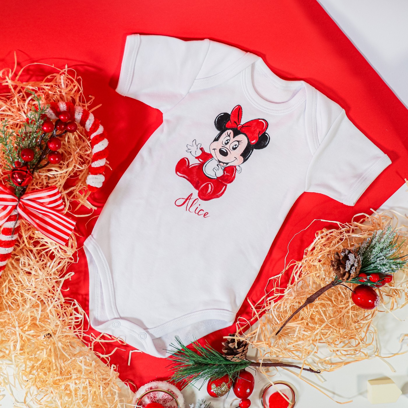 Body baby dipinto a mano. Il disegno è ispirato alla dolcissima Minnie, uno dei personaggi più amati dai primi mesi di vita. Il disegno augura felicità e allegria alla piccola.