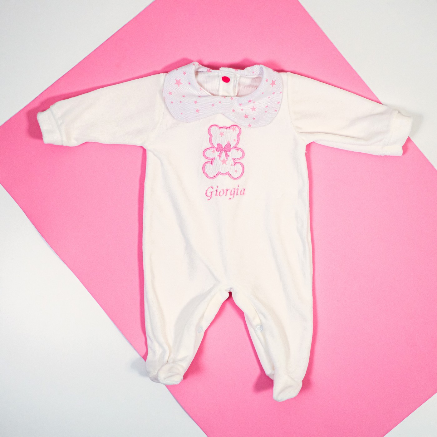 Body in ciniglia con orsetto e colletto in tessuto notte stellata. Il body è curato nei minimi dettagli e il colletto è stato ideato a mano con la chiusura a bottoncino a clip antigraffio nello stesso colore delle stelline.