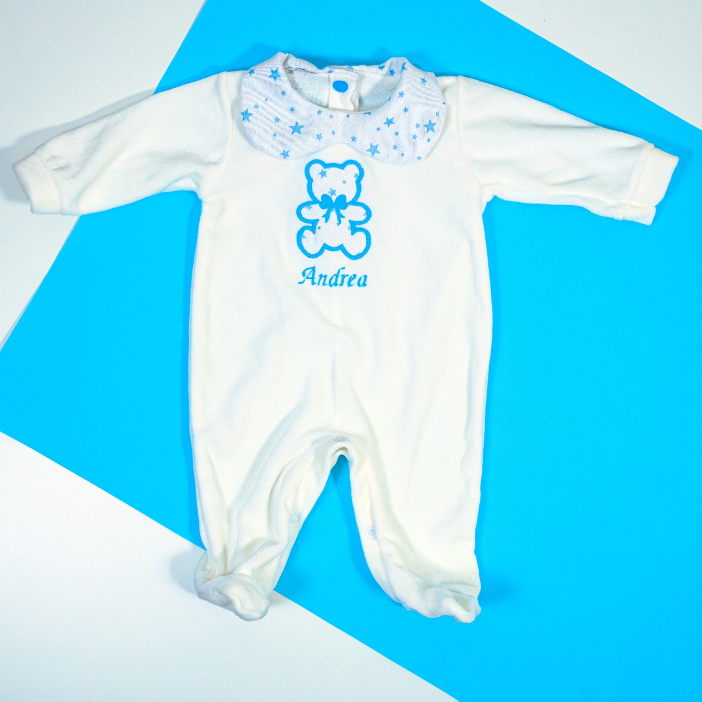Il nome e le rifiniture dell’orsetto sono ricamati. Ideale per il giorno della nascita come primo cambio.