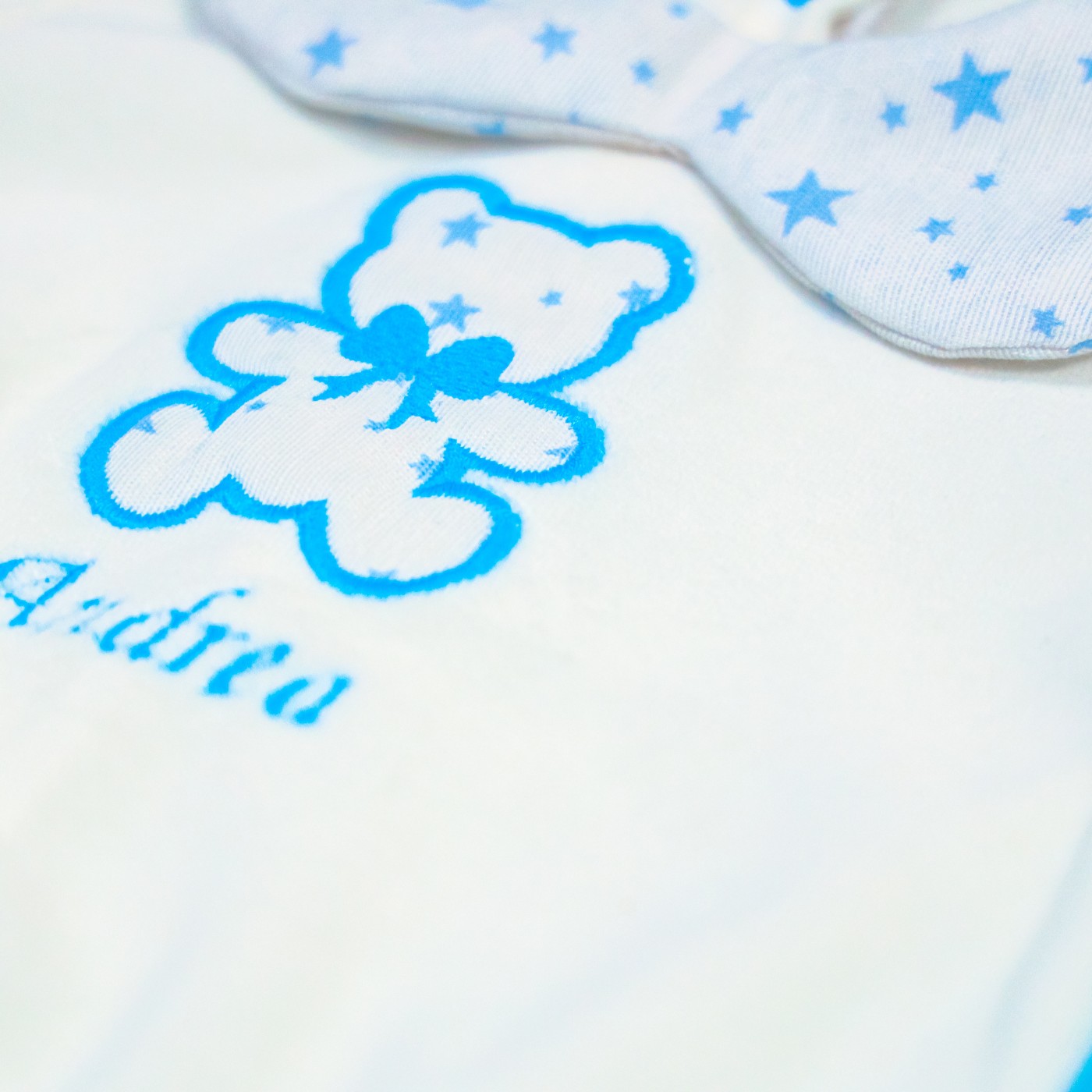 Body in ciniglia con orsetto e colletto in tessuto notte stellata. Il body è curato nei minimi dettagli e il colletto è stato ideato a mano con la chiusura a bottoncino a clip antigraffio nello stesso colore delle stelline.