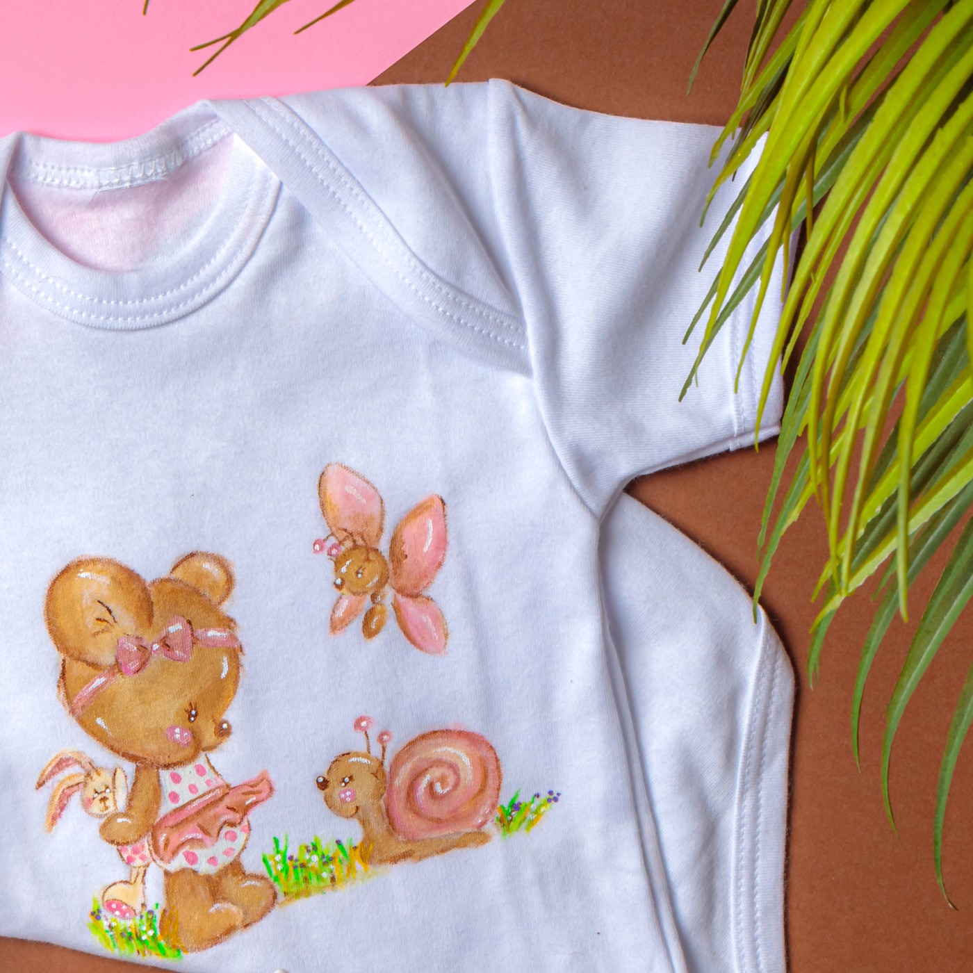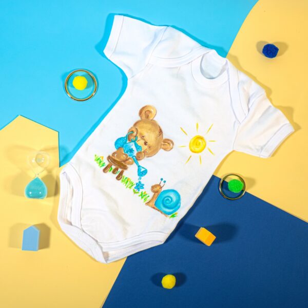 Body baby per femminuccia. Disegni dipinti a mano in cui viene rappresentato un tenero orsetto protettivo per il bimbo.
