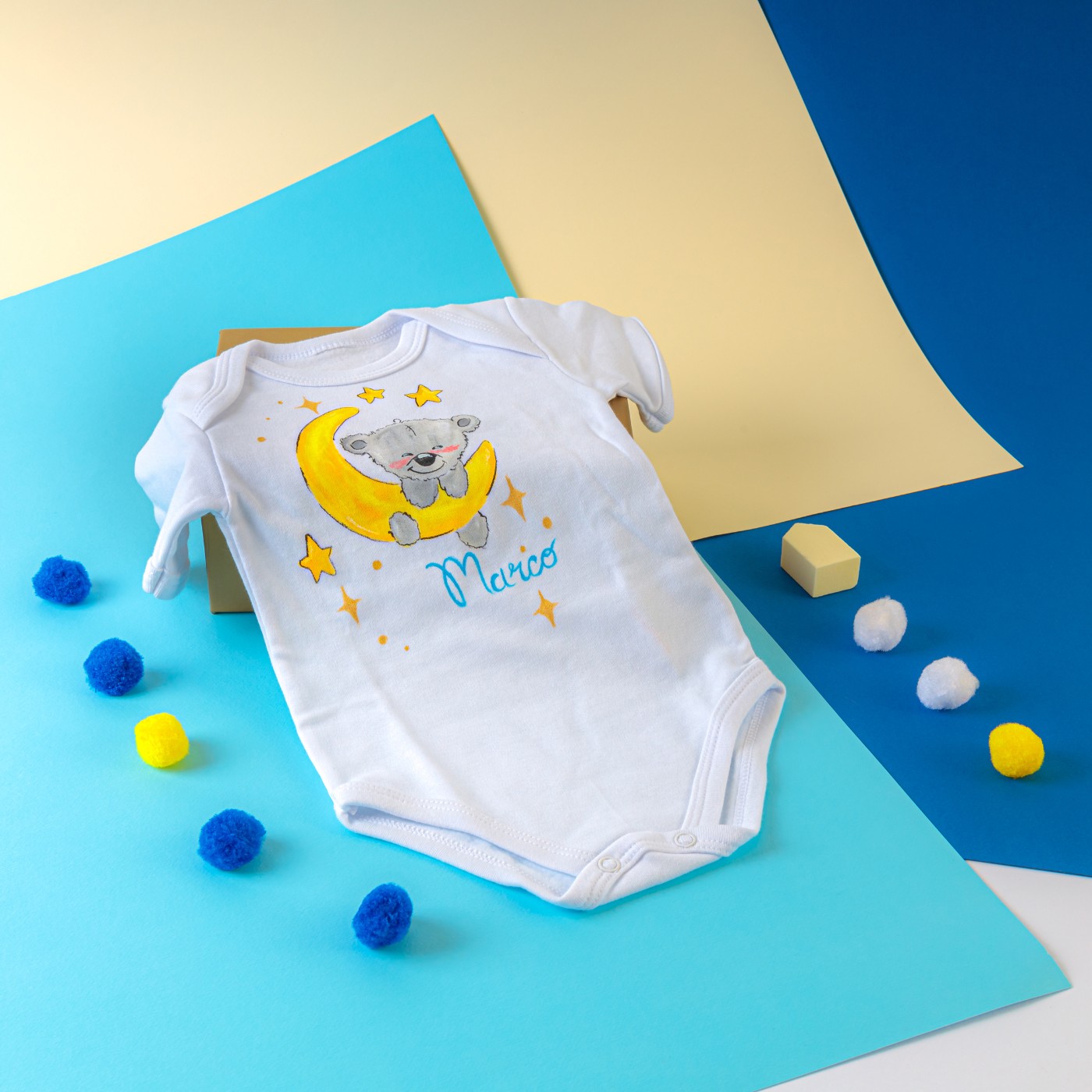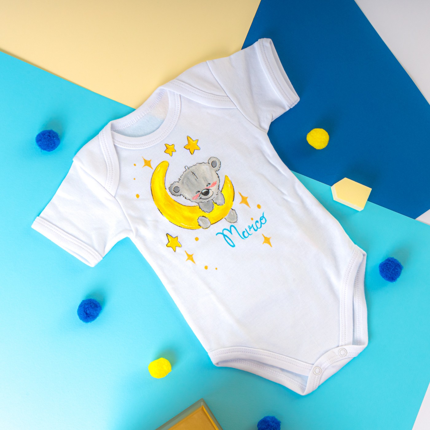 Body per neonato dipinto a mano composto da un tenero orsetto sulla luna circondato da stelline per augurare una serena e felice vita al neonato.