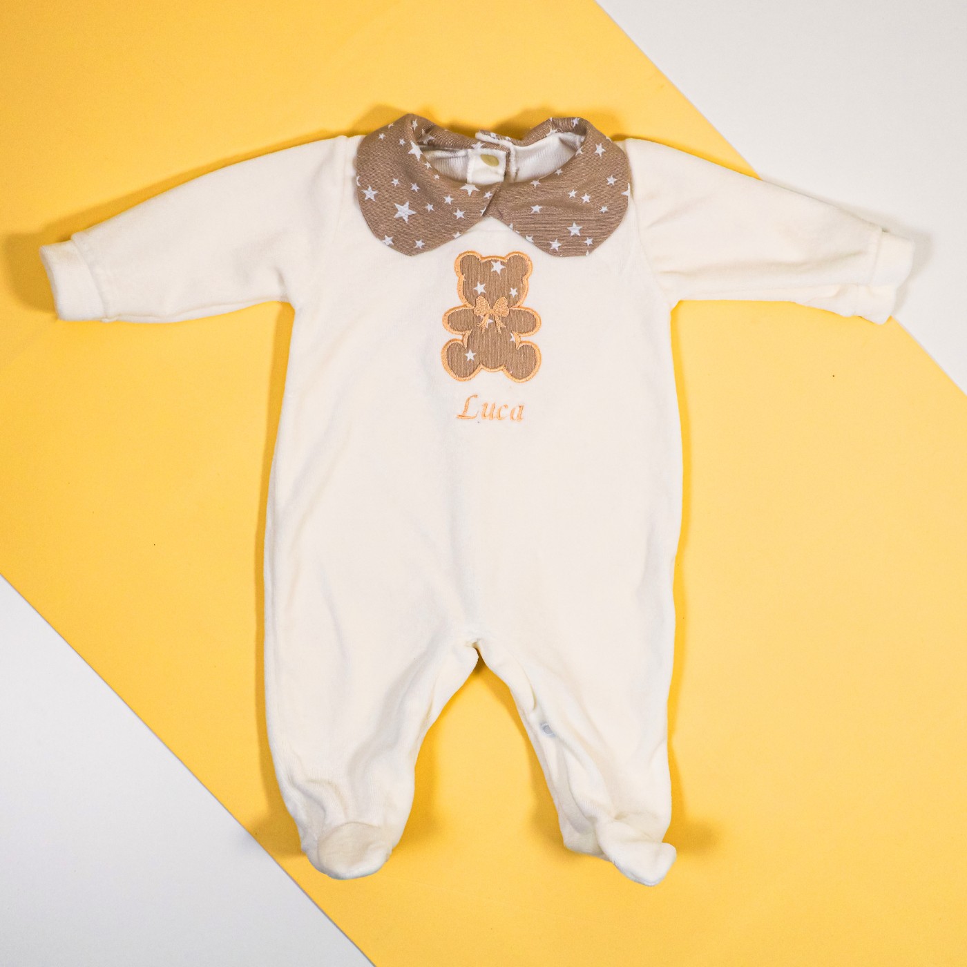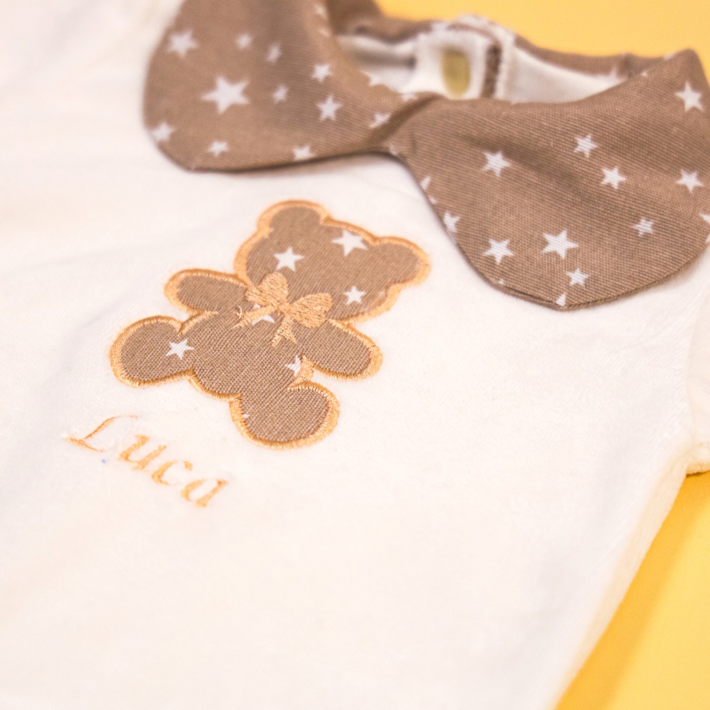 Body in ciniglia con orsetto e colletto in tessuto notte stellata. Il body è curato nei minimi dettagli e il colletto è stato ideato a mano con la chiusura a bottoncino a clip antigraffio nello stesso colore delle stelline.