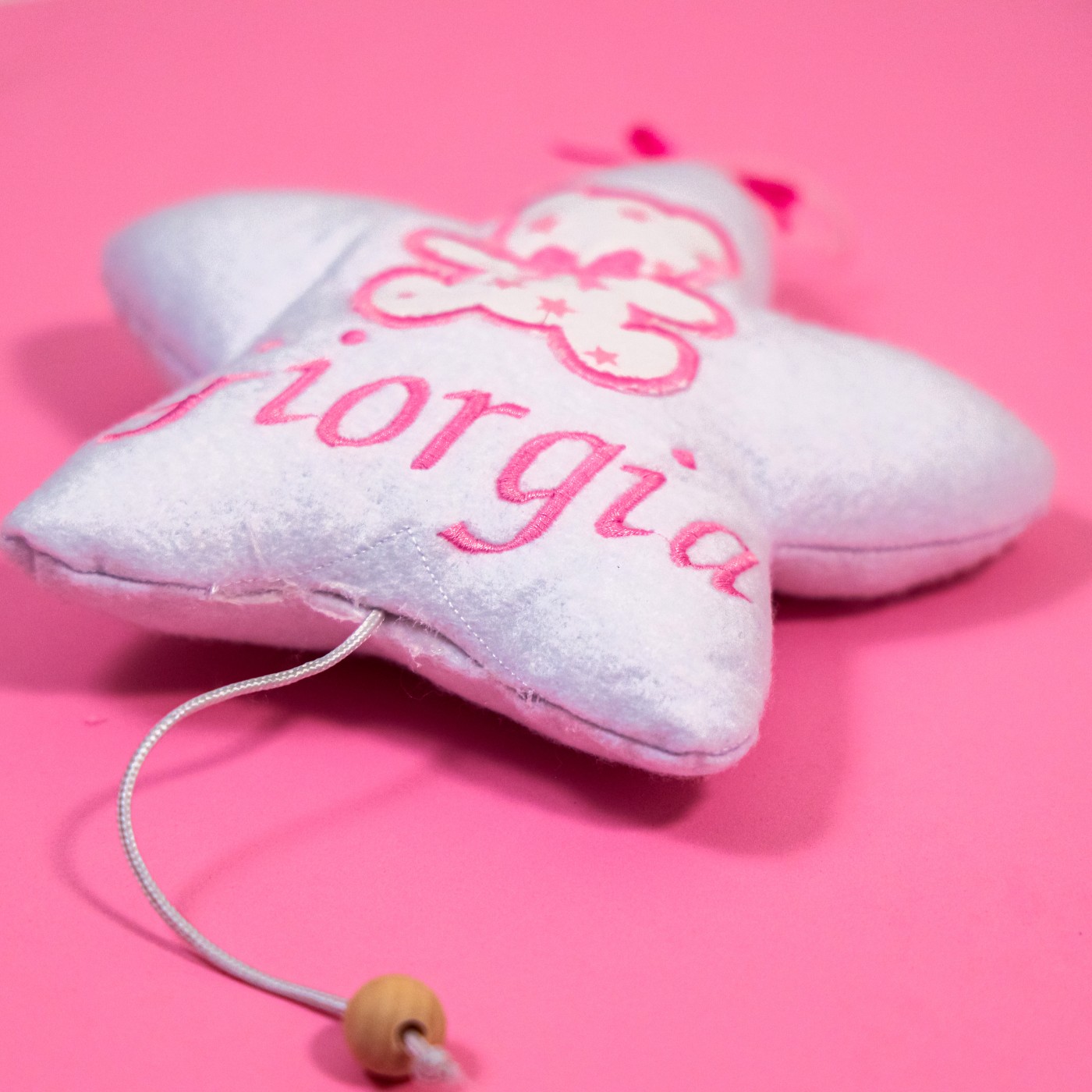 Prodotto caratterizzato dall’orsetto ricoperto dal tessuto notte stellata con rifiniture e nome ricamati.