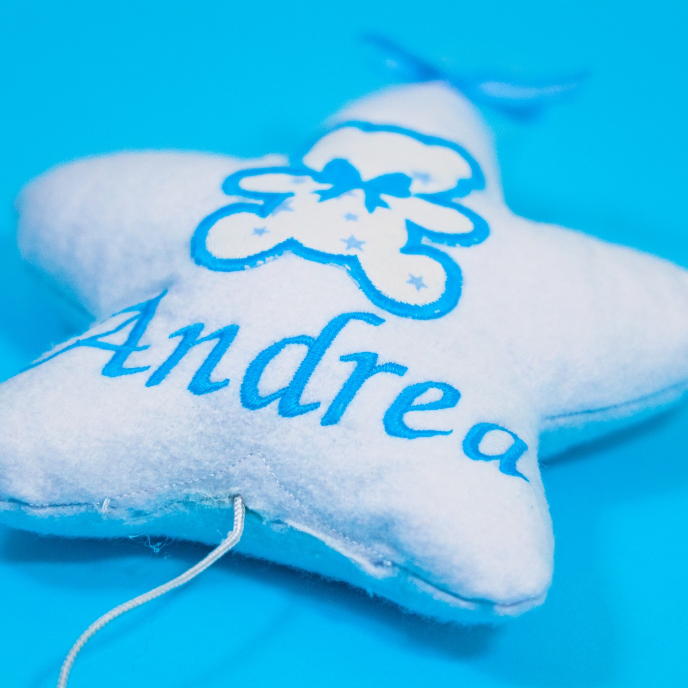 Prodotto caratterizzato dall’orsetto ricoperto dal tessuto notte stellata con rifiniture e nome ricamati.