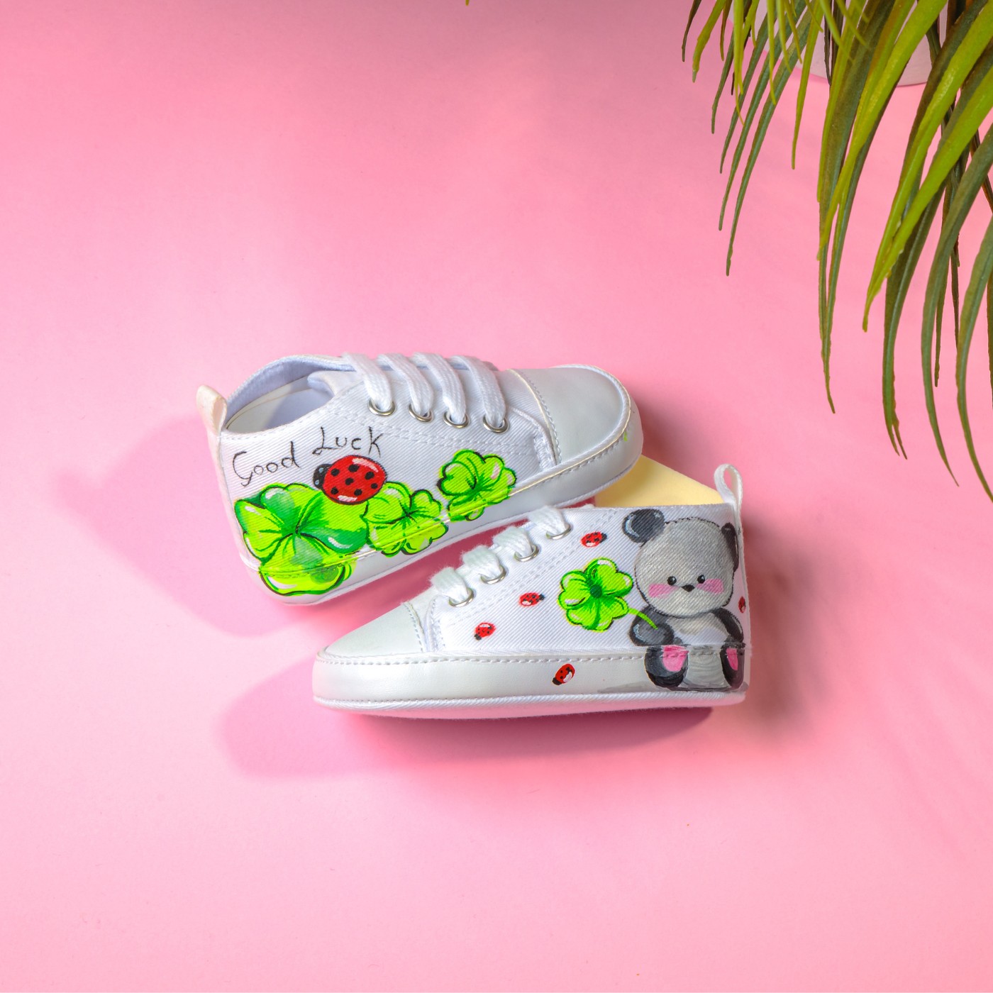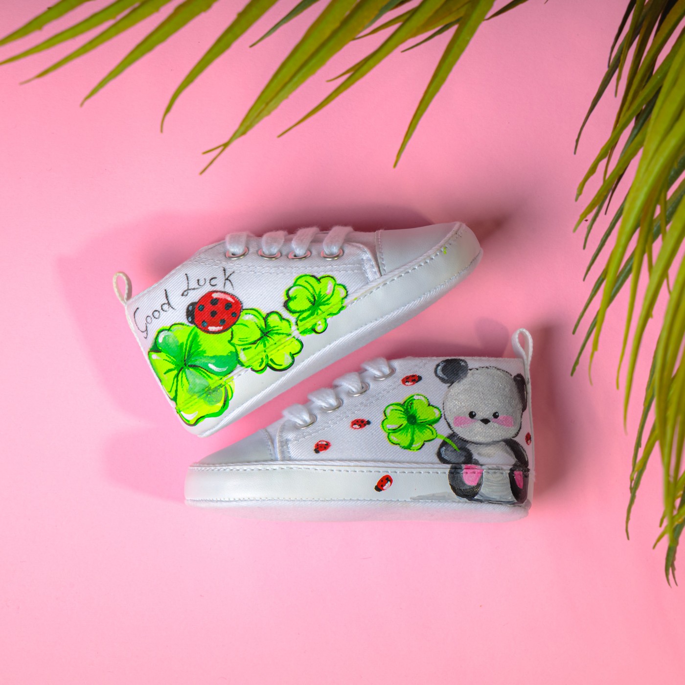 Scarpina baby dipinta a mano composta da un dolce koala che augura una vita fortunata al neonato.