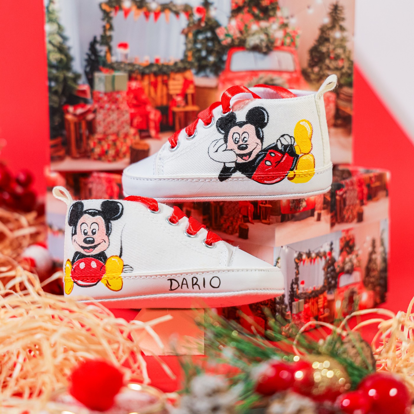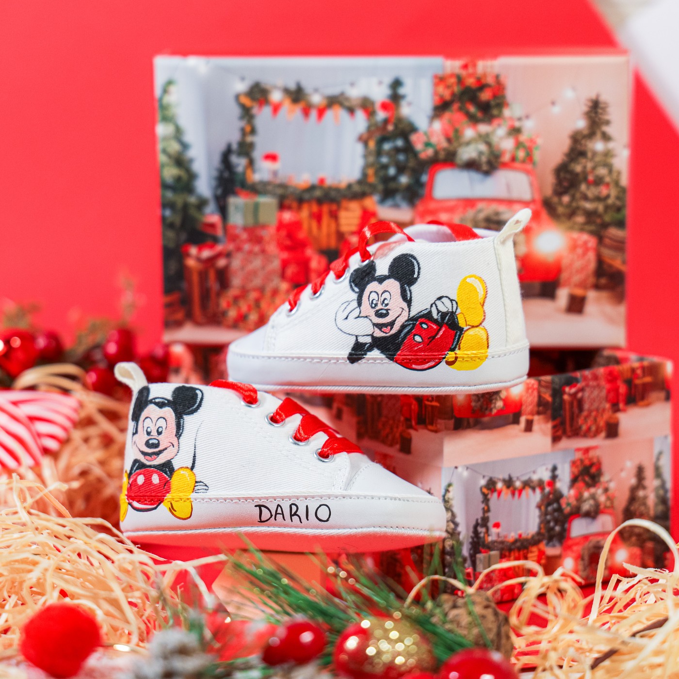 Scarpina baby dipinta a mano. Il disegno è ispirato a topolino, uno dei personaggi più amati dai primi mesi di vita. Il disegno augura felicità e allegria al piccolo.