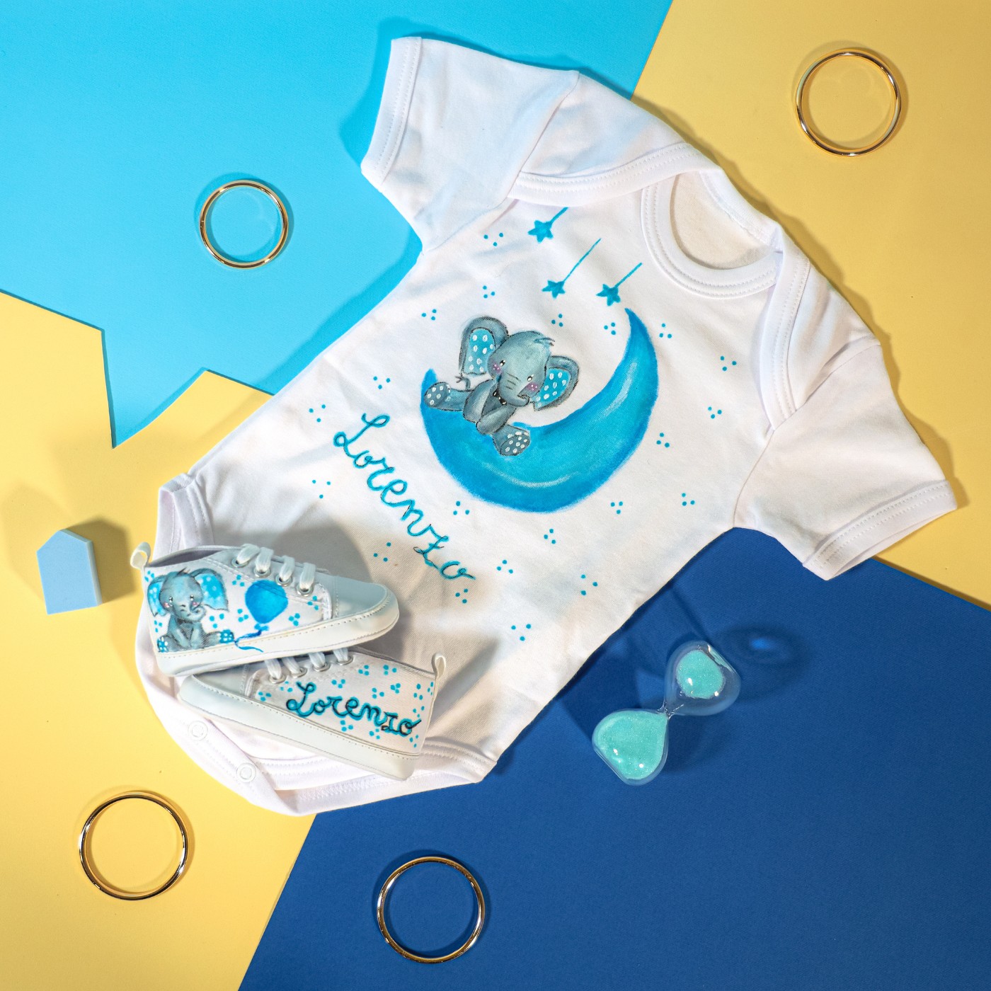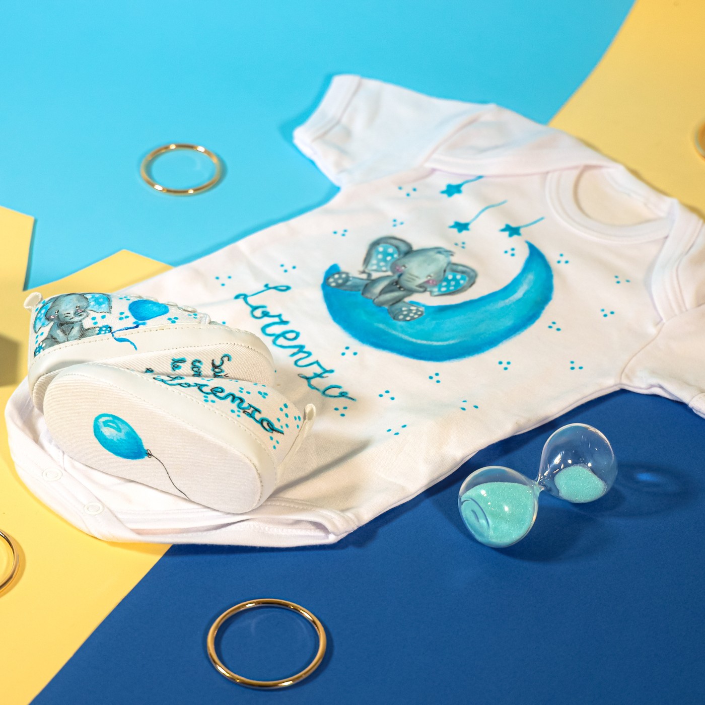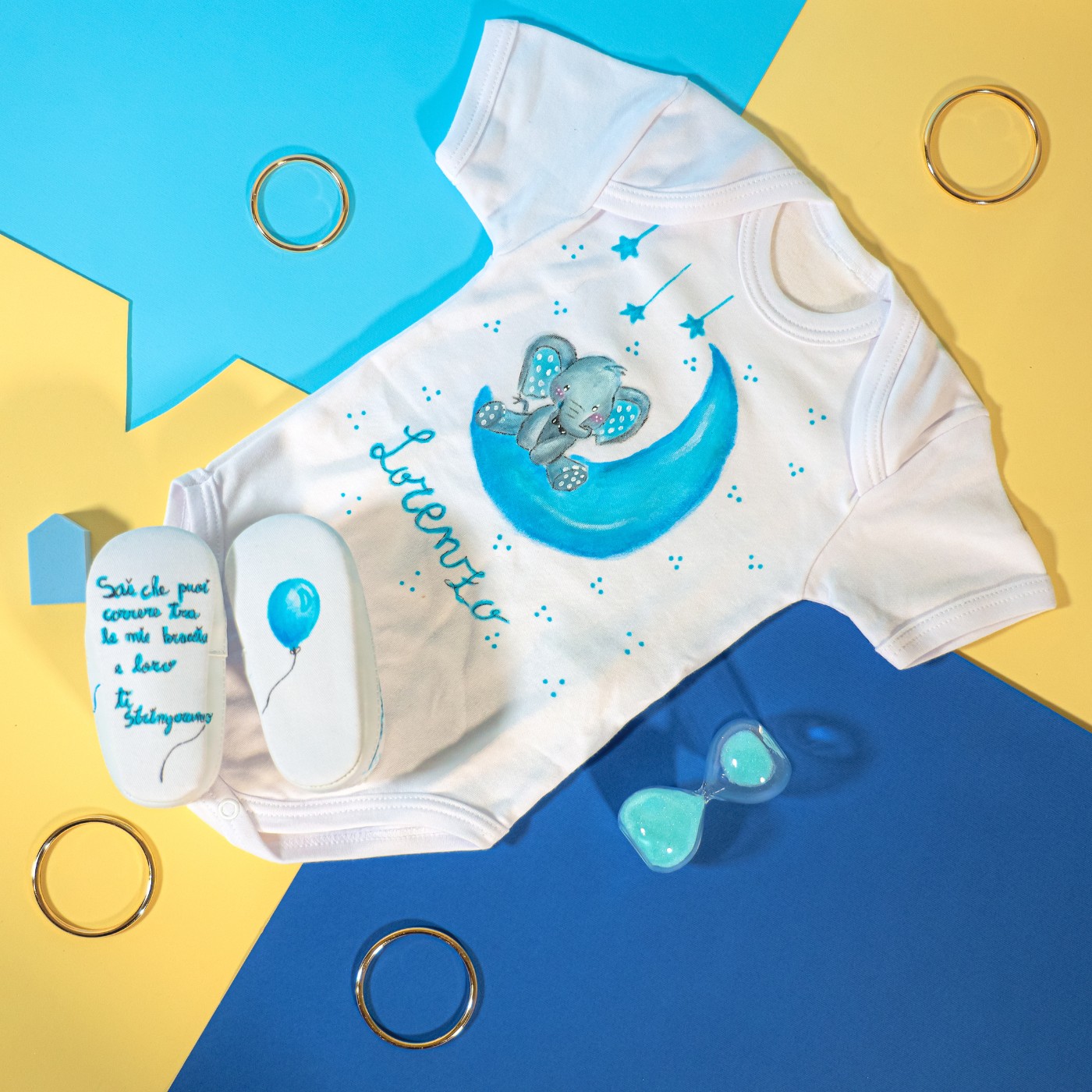 Set baby unisex dipinto a mano. Il disegno è ispirato adun piccolo elefante impreziosito da palloncini , stellina e luna ,per esprimere innocenza,libertà e tranquillità,spesso è donato in occasioni importanti come battesimo e nascita.