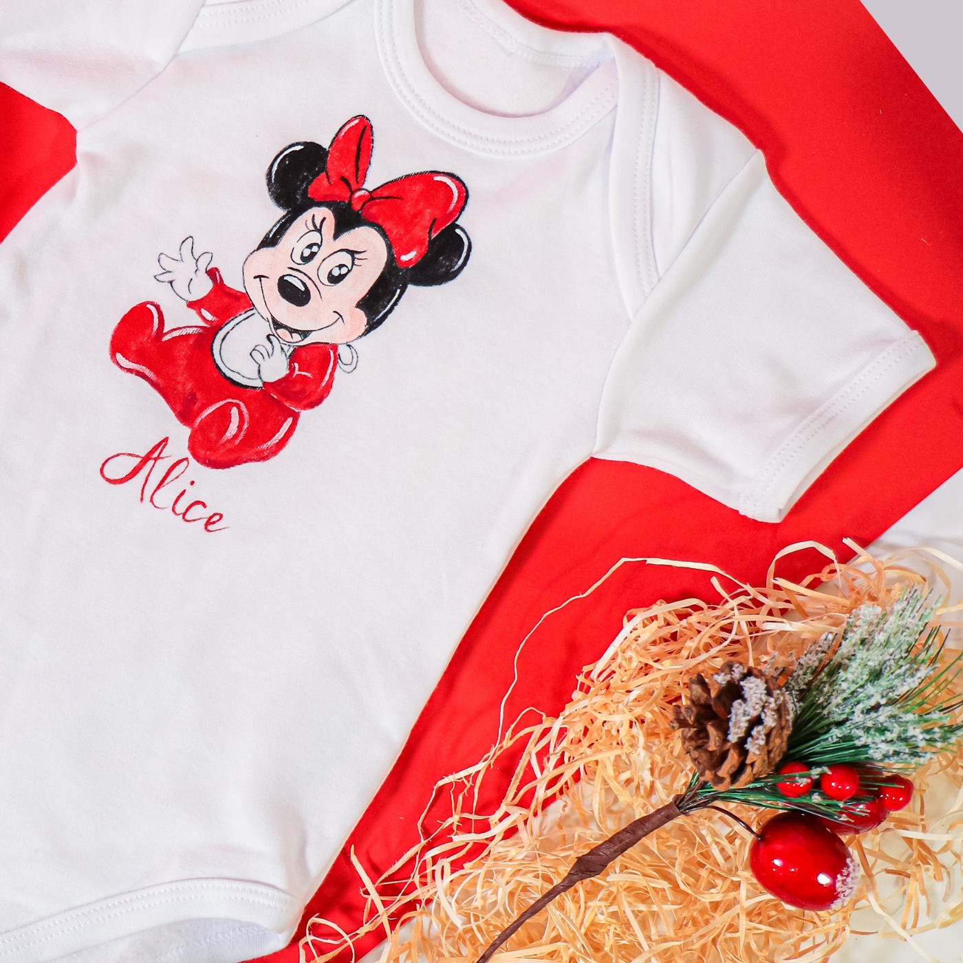 Set baby dipinto a mano. Il disegno è ispirato alla dolcissima Minnie, uno dei personaggi più amati dai primi mesi di vita. Il disegno augura felicità e allegria alla piccola.