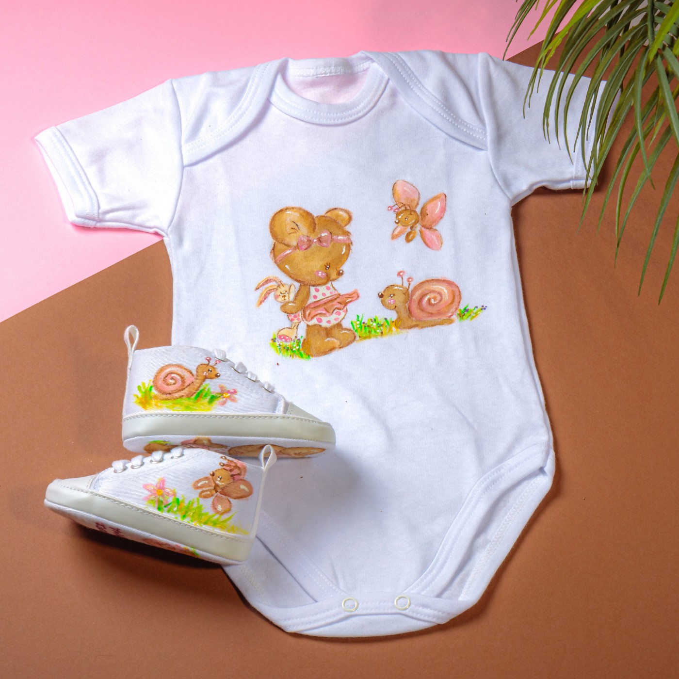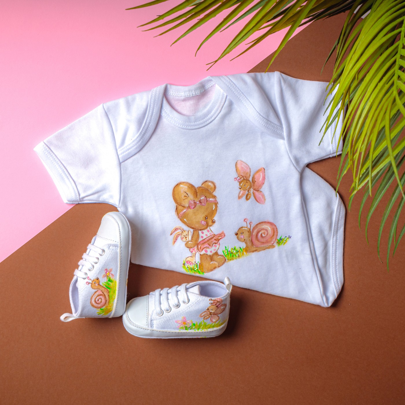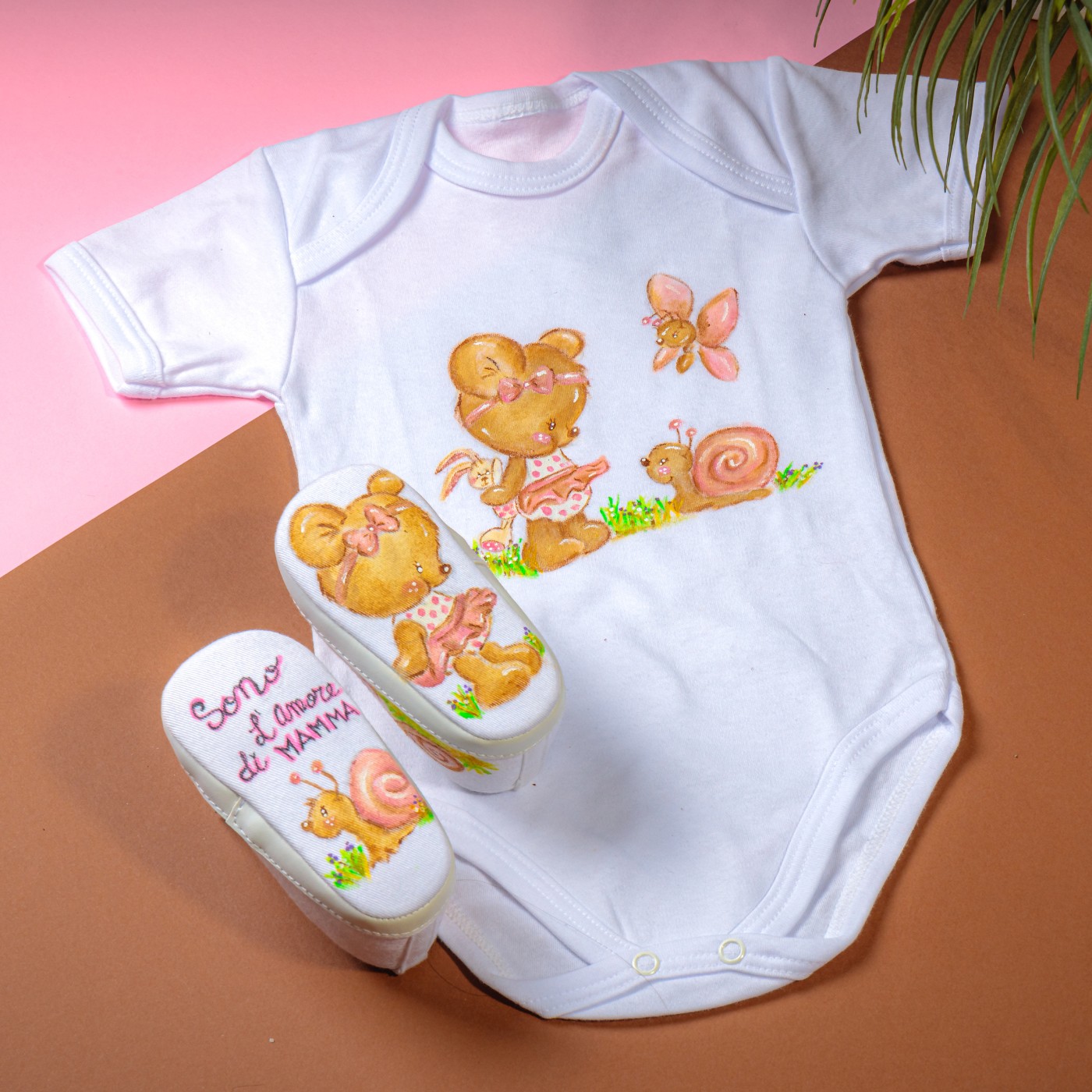 Set baby per femminuccia. Disegni dipinti a mano in cui viene rappresentato un tenero orsetto protettivo per il bimba.