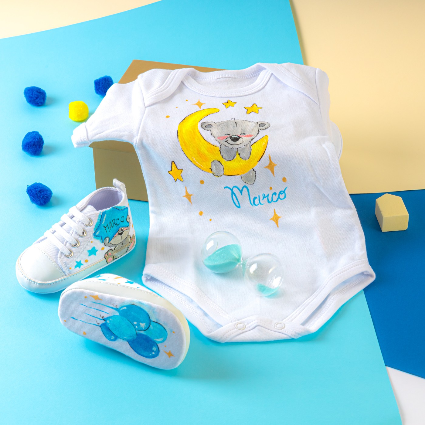 Set neonato dipinto a mano composto da un tenero orsetto coccolato da palloncini e stelline per augurare una serena e felice vita al neonato.