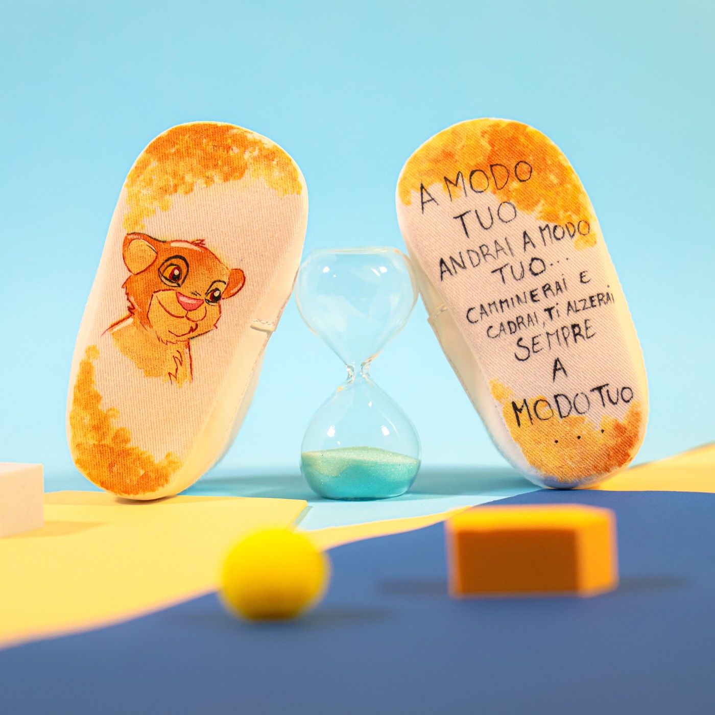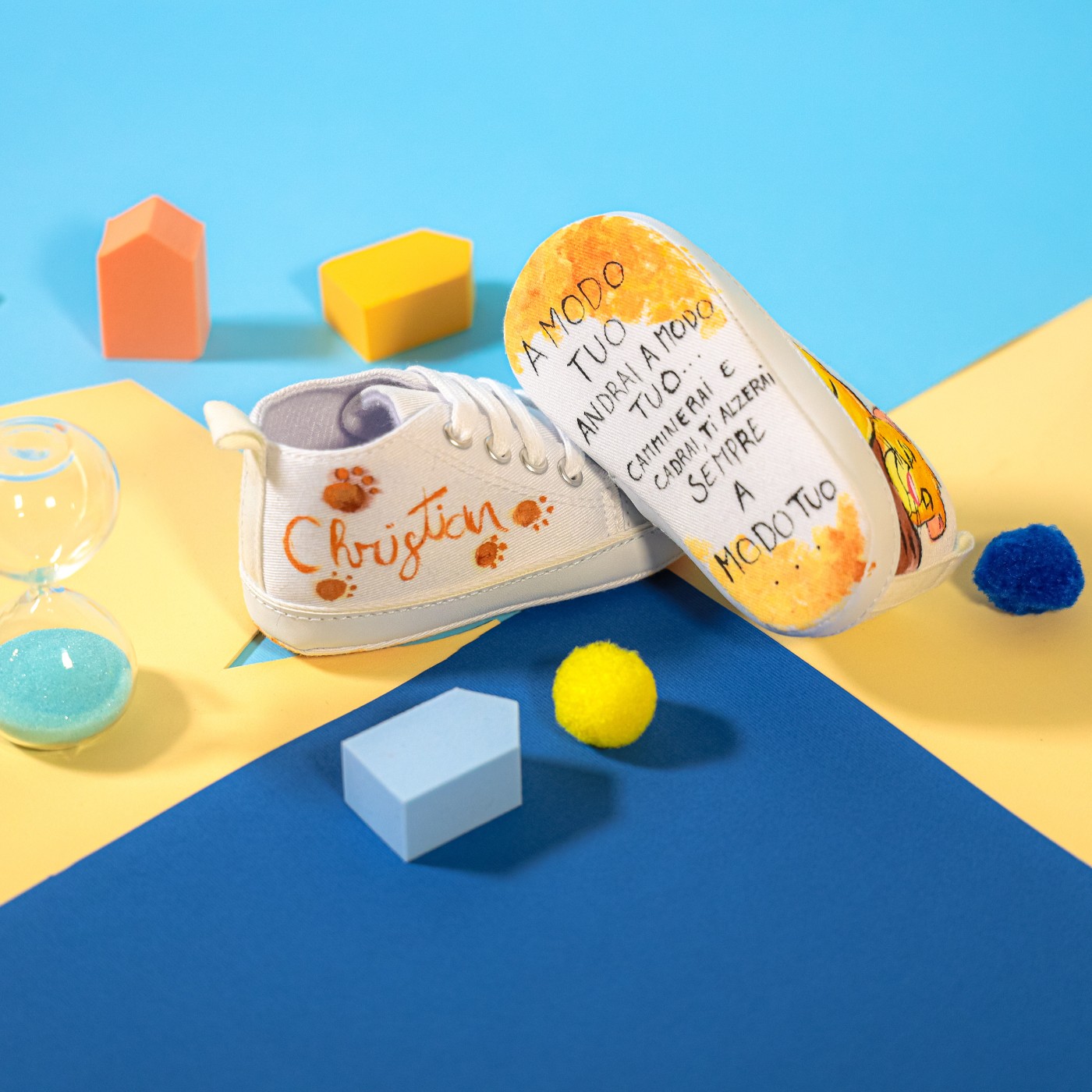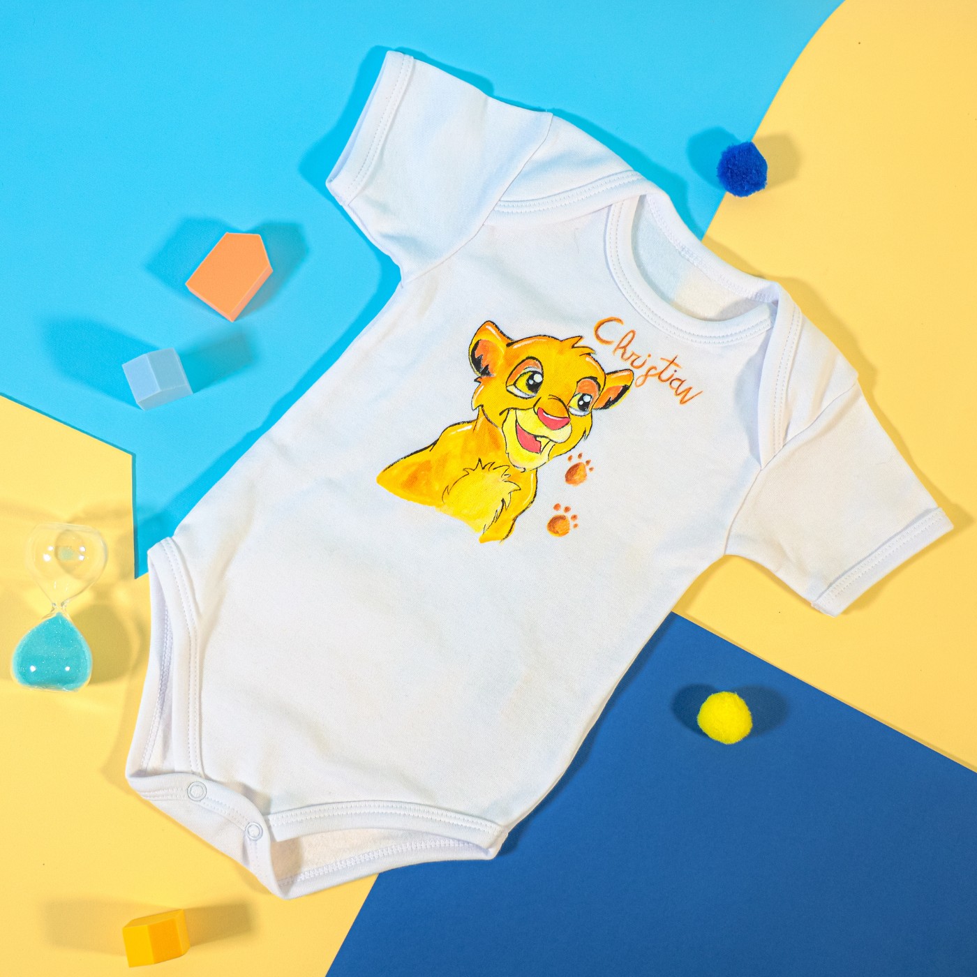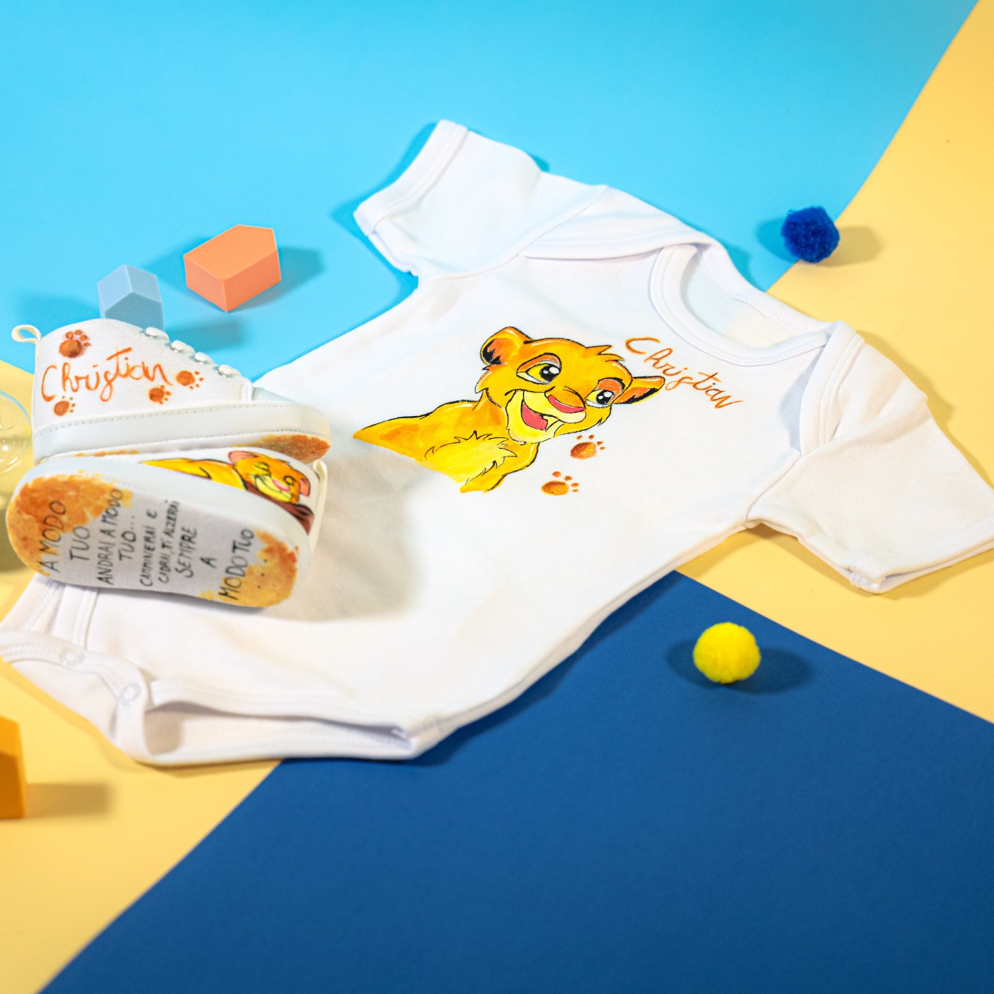 Set baby unisex dipinto a mano su base bianca. Il disegno è tra i più richiesti della nostra collezione ed esprime forza, dolcezza e vitalità.